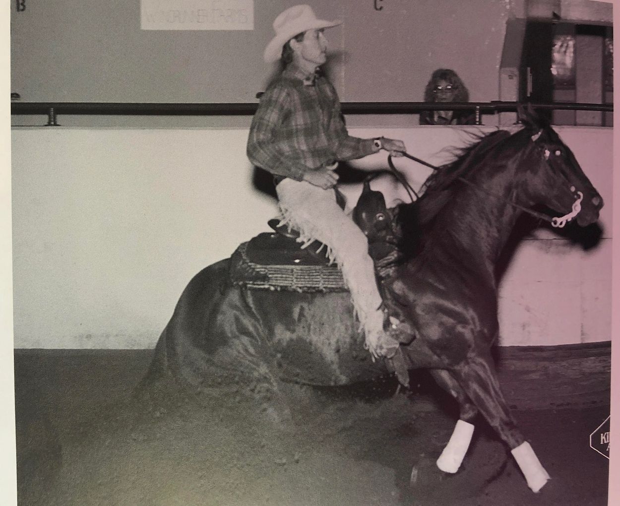 Texas trainer and reining great Craig Johnson slides to a stop aboard Sparkles Suzana. This 1985 daughter of Zan Parr and Diamonds Sparkle won the 1989 NRHA Derby, then returned to the show arena in 1992 to earn the senior calf roping world championship.