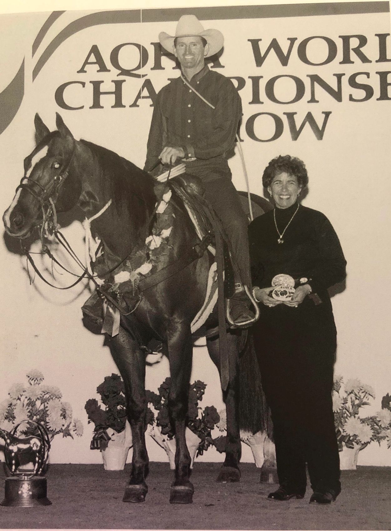 A full sister to Sparkles Rosezana, Sparkles Suzana won many awards, including the 1992 AQHA senior calf roping world title, She's shown here with Bobby Lewis and Carol Rose.